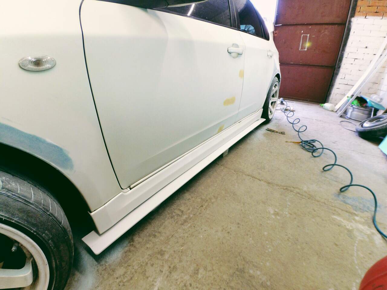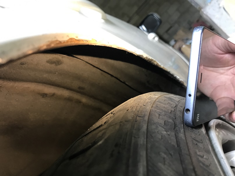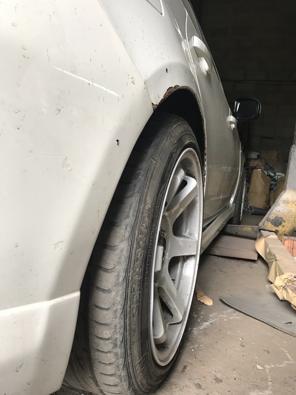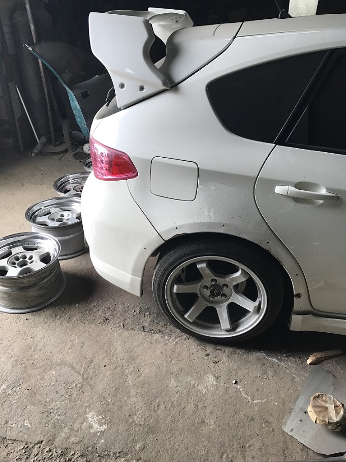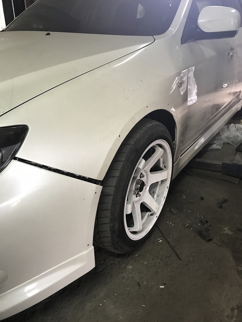 итак все таки дошло дело, первые фото, арки разрезаны, были под гидравликой на растяжках что бы приняли форму и не возвращались в предыдущее положение, пропилы были сделаны в изнутри арок, местами толщина до двух пальцев, по фото конечно не очень понятно, но диски 9.5 дюймов с 30 вылетом, при занижении должен обхватить полностью, так же сами арки были прогреты и закатаны роллером по максимуму и с максимальной натяжкой, так что начинаем сварку, ждем заказанные тейны с edfc с япы!!! :roll: