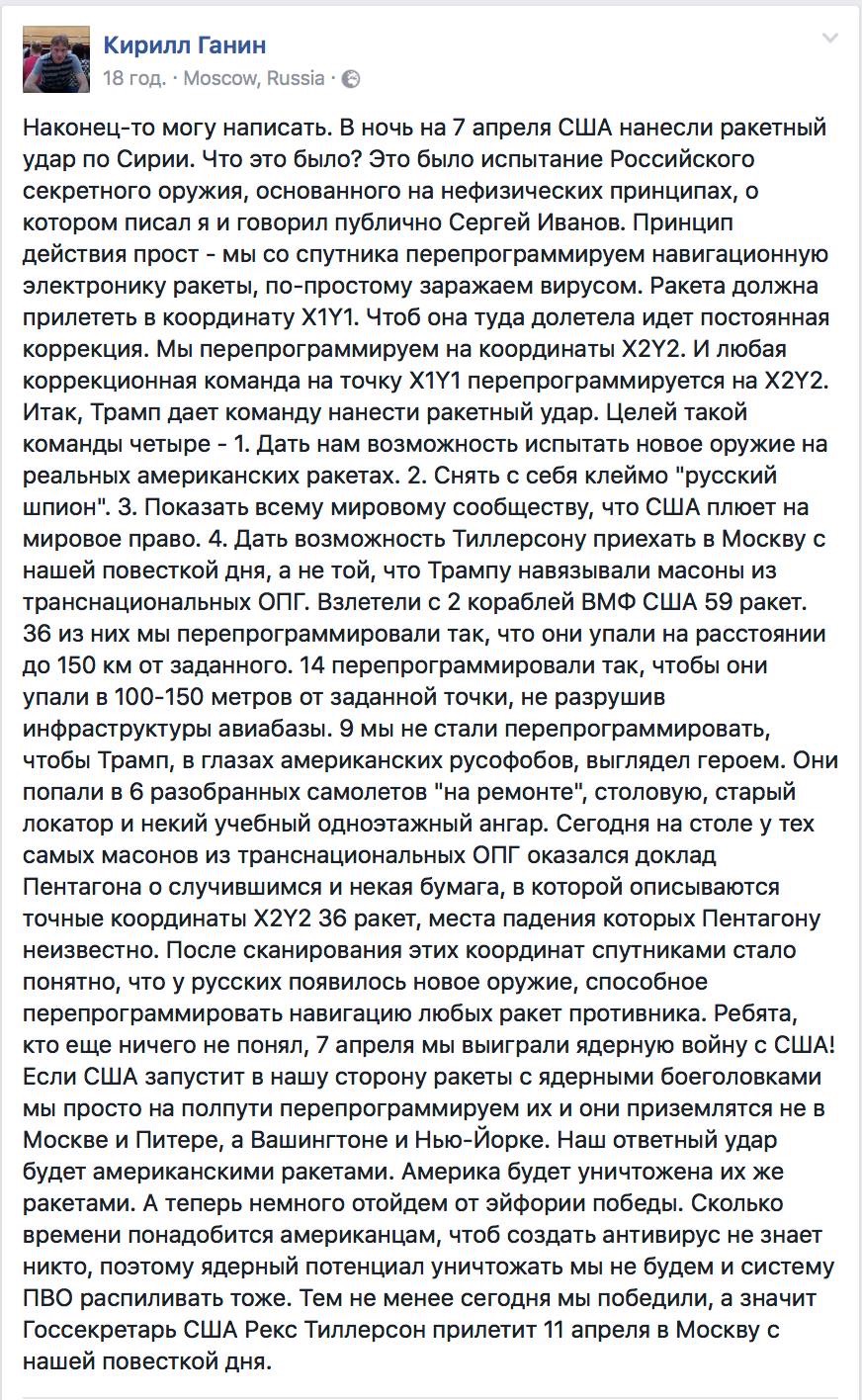И вот теперь в Сирии как-то не оказалось вокруг Шайрата ни хитрых маячков с ложным радиосигналом, ни адских микроволновок. Можно, конечно, сколько угодно рассказывать, что там больше половины Томагавков не достигли цели, но по снимкам видно, что практически весь пакет-букет — ещё как достиг. При этом нужно понимать, что стационарный ангар на военном аэродроме — это не укрытие от дождика и не огуречная теплица из поликарбоната.