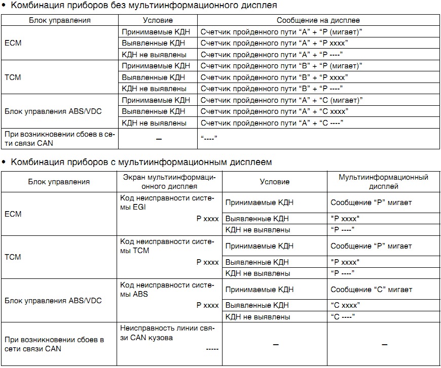 • После перехода в режим отображения КДН, дисплей меняется каждые 3 секунды, и при каждом нажатии кнопки счетчика пройденного пути режим отображения КДН меняется между {ECM}, {TCM} и {ABS/VDC}. В зависимости от типа блока управления, в приведенной ниже таблице КДН отображаются по следующим категориям: принимаемые КДН, выявленные КДН, отсутствие КДН.