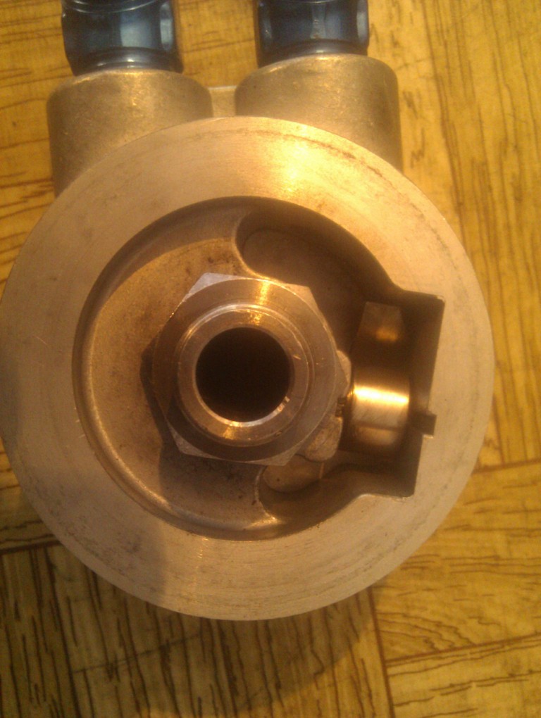 Проставка с Инфининити не китай, без термостата но с биметаллической пластиной. Когда масло холодное идет через куллер и через отверстие в сендвиче, когда нагревается пластина закрывает отверстие и масло идет только через куллер. 500грн.