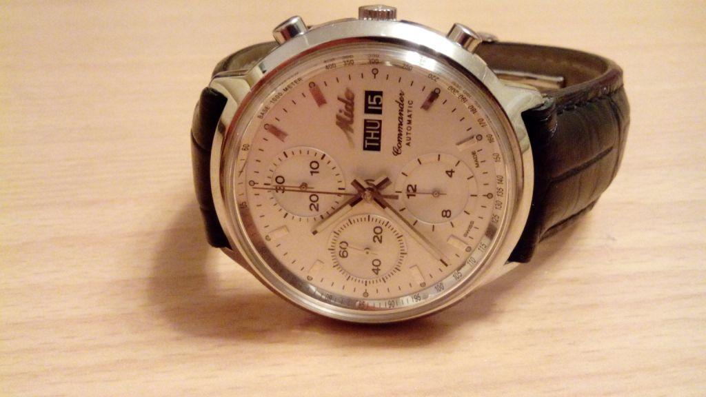 Механика с автоподзаводом, хронограф, диаметр корпуса 40мм, калибр MIDO 1320 на базе ETA 7750 Valjoux (секундомер, дата, день недели), черный кожаный ремень с клип-застежкой, хезалитовое стекло (стеклопластик), корпус – моноблок из нержавеющей стали.